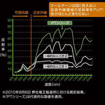 - PTシリーズに採用しているモノフィラメントヤーンは一般的な人工芝をはるかに上回る「日射反射機能」を備え、直射日光による温度上昇を抑えます。